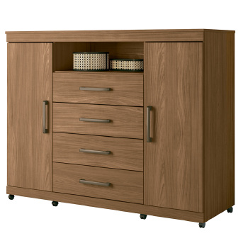 Ela possui 4 gavetas super espaçosas e duas portas, sendo uma delas com cabideiro e outra com prateleiras que vão ser ideais na hora de guardar e organizar suas roupas e objetos pessoais! Além disso, ela conta ainda com um nicho que vai ser perfeito para os aparelhos eletrônicos!